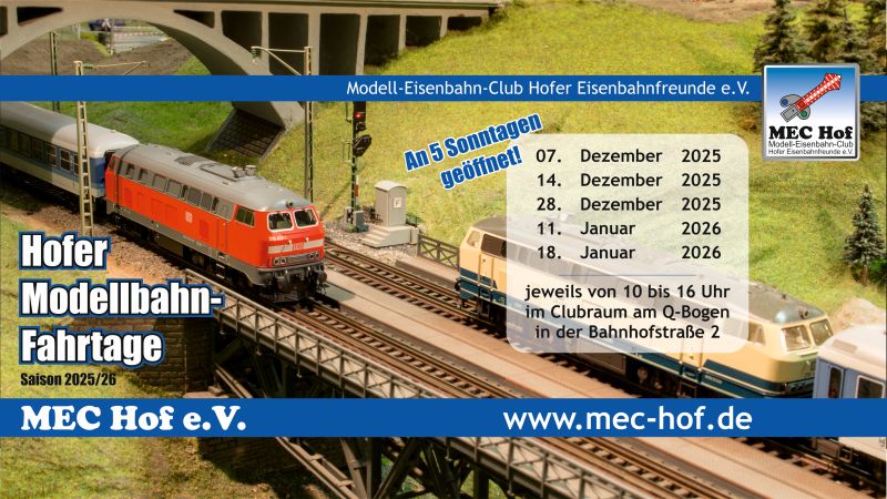 Der MEC Hof e.V. wünscht allen Eisenbahnfreunden und Modelleisenbahnern ein gesegnetes und friedvolles Weihnachtsfest und einen guten Rutsch ins Jahr 2018![Dienstag, 21.11.2017]